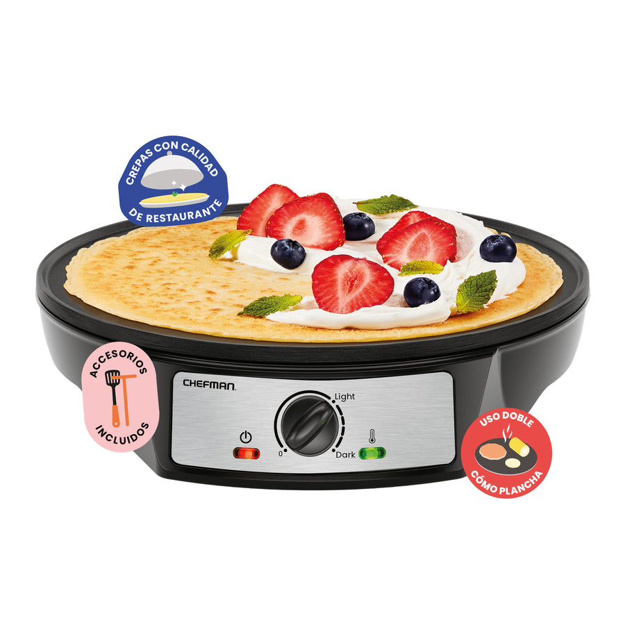 - PARA CADA ANTOJO DE DESAYUNO: Haz de cada mañana un regalo con tu plancha eléctrica Chefman Crepe Maker. Sirve deliciosas crepas, blintzes, panqueques, huevos y tocino rápida y fácilmente. La superficie antiadherente de 30 cm es ideal para alimentar a toda la familia. Esta sartén multifuncional para crepas funciona como plancha, perfecta para el desayuno, el brunch, el almuerzo o incluso la cena.