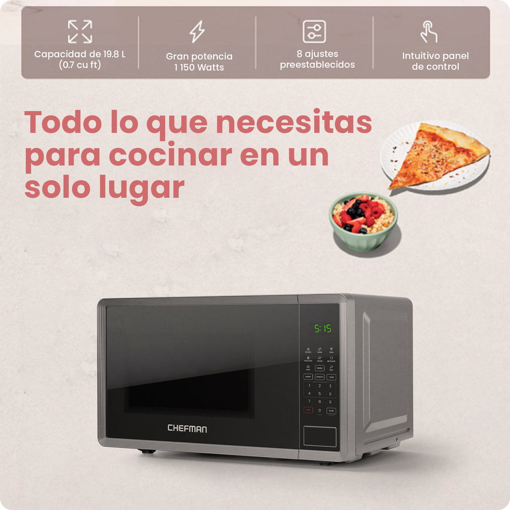COCINA EXPRESS: 8 programas automáticos para palomitas, papas, pizza, verduras, bebidas y sobras; alimentos perfectamente cocinados sin complicaciones.