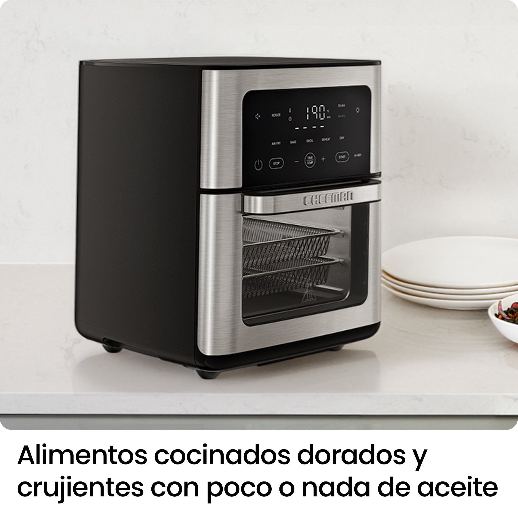 - TODO LO CRUJIENTE, SIN CULPA: Disfruta de alimentos dorados y crujientes con hasta un 98 % menos de aceite gracias a la tecnología de freído por aire de Chefman. Olvídate de las frituras tradicionales y cocina de forma saludable sin perder sabor ni textura.