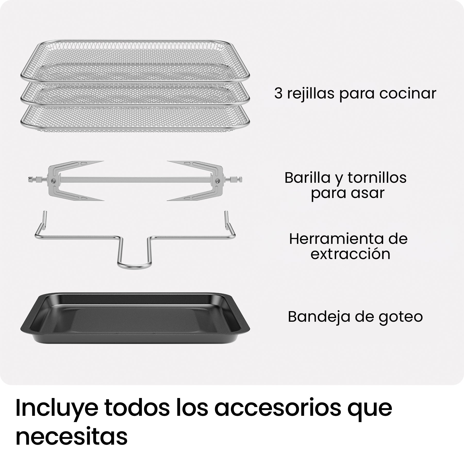 - INCLUYE TODOS LOS ACCESORIOS NECESARIOS: Viene equipada con 3 rejillas de cocción, asador giratorio, herramienta de extracción y bandeja de goteo/horneado. Todos los accesorios son aptos para lavavajillas en la rejilla superior para una limpieza rápida y sencilla.